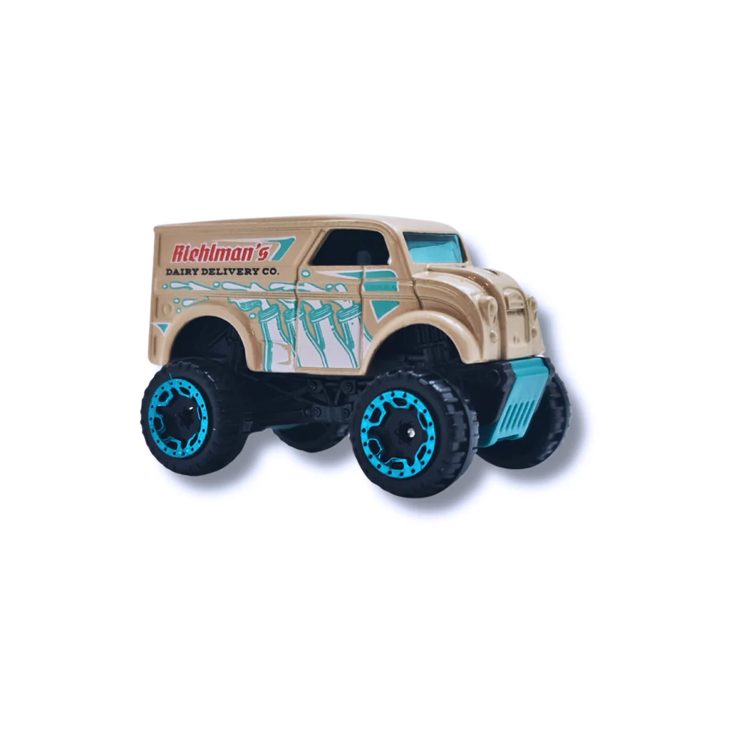 مدل Monster Dairy Delivery یکی از طراحیهای محبوب هاتویلز است؛ ترکیب ون کلاسیک با لاستیکهای بزرگ حس یک خودروی قدرتی و جذاب را ایجاد کرده. رنگآمیزی کرم و آبی، رینگهای آبی متالیک و جزئیات دقیق روی بدنه باعث شده این مدل در مجموعه Let’s Race کاملاً متمایز باشد.